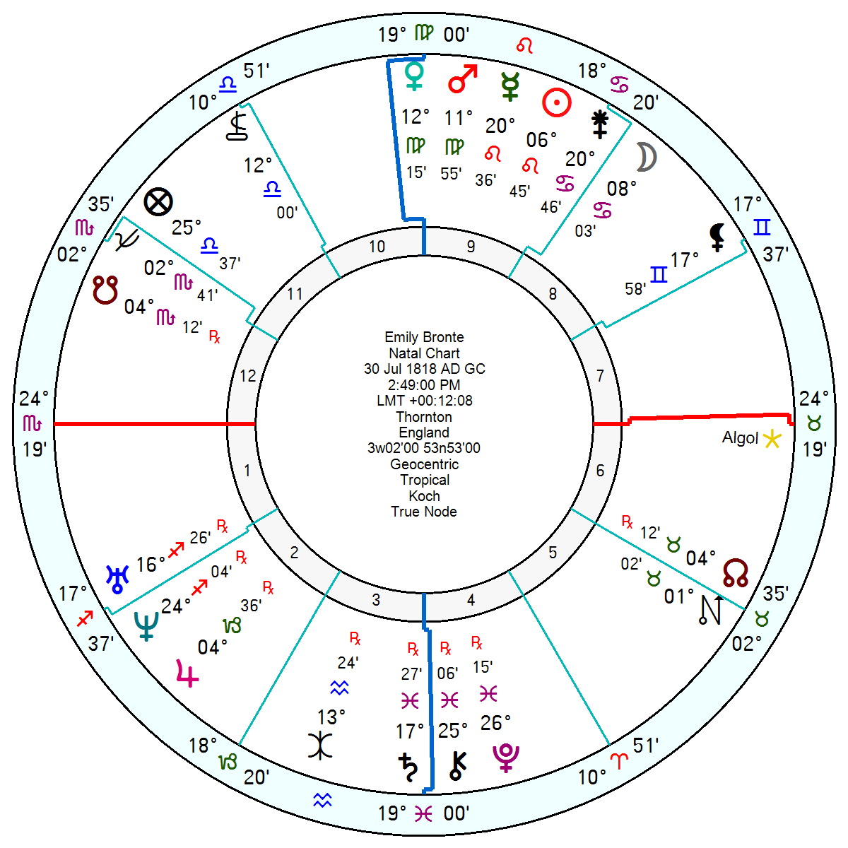 Emily Bronte, born 30 July 1818 2.49pm Thornton, England, had a Leo Sun and Mercury in the 9th house of communication and writing and a Cancer Moon deeply buried in the 8th. But what marked out her subject matter was a volatile, Mutable T square of a passionate Venus Mars conjunction in Virgo in the 9th opposition a regretful Saturn in Pisces square Uranus in Sagittarius. Venus Mars can give an inclination to strong sexual yearnings. Mars Saturn can be cruel. Mars Venus square Uranus – a need for constant excitement without ties. It is quite a perverse chart. She had the destructive Fixed Star Algol conjunct her Descendant. A controlling Pluto in her 4th hinted at a tricky father and dark undercurrents running through the family home. There are some theories that she was autistic. She died a year after publication of her novel, on her First Saturn Return, possibly from tuberculosis, never having married.