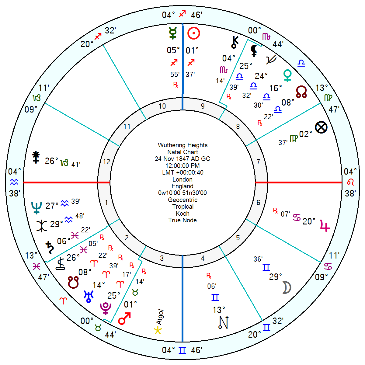 The novel was published on 24 November 1847 with a rage-filled and frustrated Sun inconjunct Mars Pluto; and maybe on the point of a yod with Mars Pluto sextile a late Gemini/Cancer Moon which would make sense of the content.