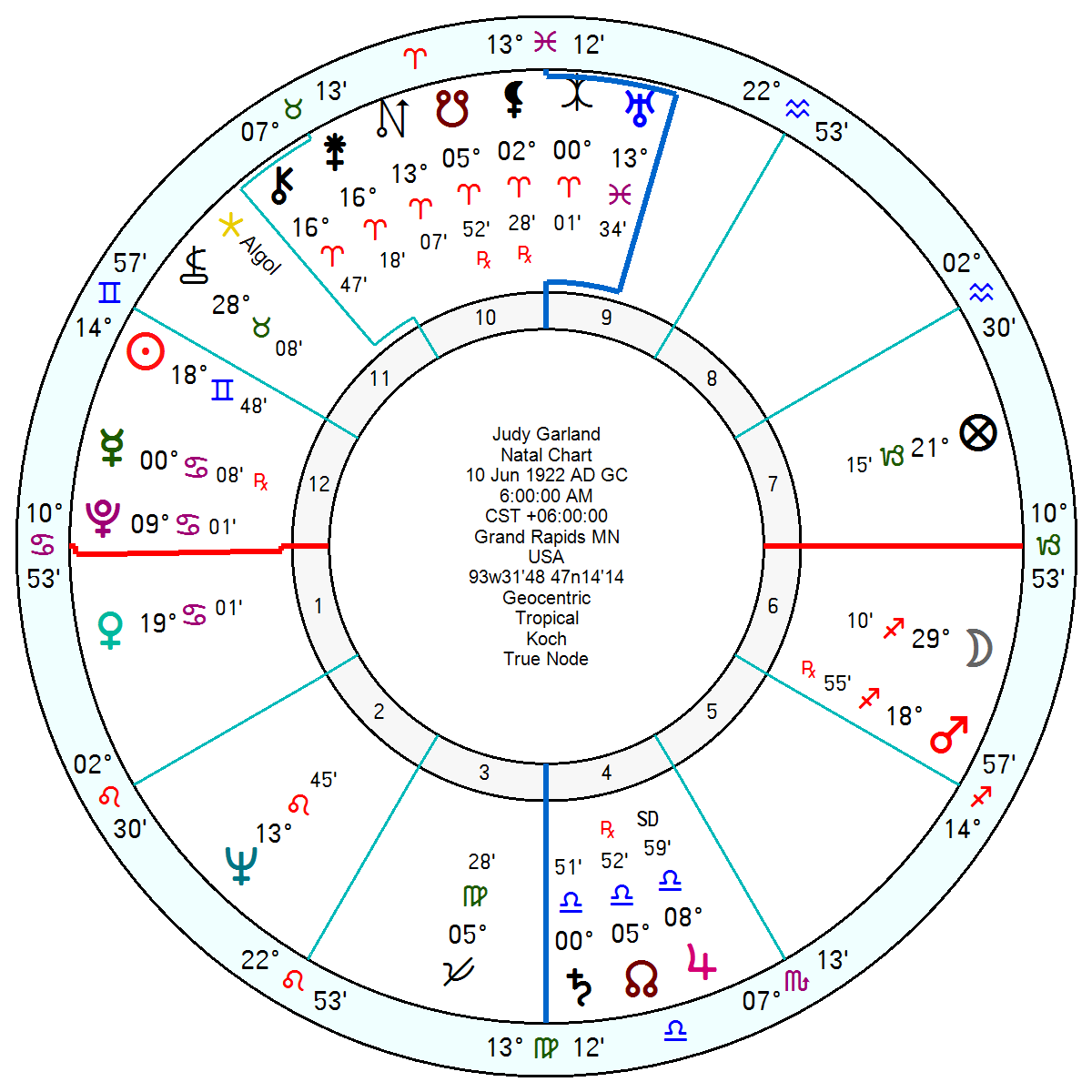 Judy Garland, 10 June 1922 6 am Grand Rapids, Minnesota, had a creative and erratic 12th house Gemini Sun opposition Mars in an explosive square to Uranus conjunct her Midheaven; with her Uranus on the apex of a yod inconjunct Neptune sextile Jupiter. Such a yod would make her stand out from the crowd, be contrary and rebellious, high spirited and unconventional. Her 4th house Saturn square Pluto on her Ascendant hinted at a bleak childhood.  She also had her Moon in her 6th house of health. If ever a pair should have avoided drink and drugs it was this one with health sensitivities so marked on both their charts.