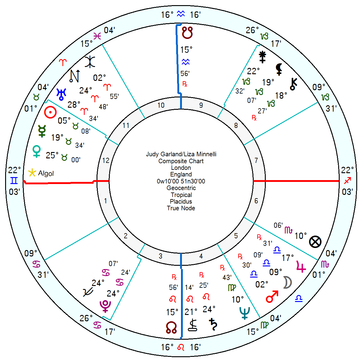 Their relationship chart was emotionally cool (partly because of Judy’s career commitments) with a composite Venus square Saturn. Angry with Moon conjunct Mars; and subject to constant upheavals and turbulence with Uranus square Pluto; with an underlying hint of a one-up-manship struggle from Pluto square Jupiter.