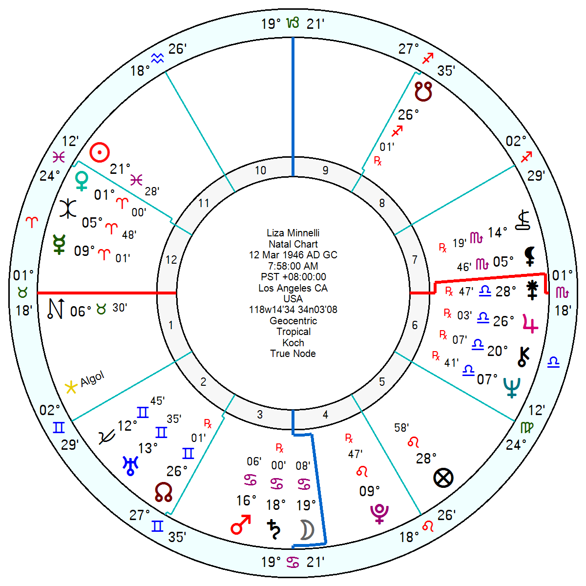 Born 12 March 1946 7.58am Los Angeles, she has a Sun Pisces in a restless, independent-minded, erratic square to Uranus and trine a horrific assembly of Mars, Saturn, Moon in Cancer.  Her father was not available and her mother was unfair to the point of cruelty, angry and laid a guilt trip on her. Unsurprisingly she had a fearful Pluto in her 4th house of childhood. Her 6th house of health and work has Jupiter, planet of luck and excess, Neptune for a delicate constitution which would not take kindly to her addictions. Her Chiron was also in her 6th hinting at a split between her body and her spirit, with relationship difficulties and too often being made to feel inferior or a servant, which she certainly was with her mother.