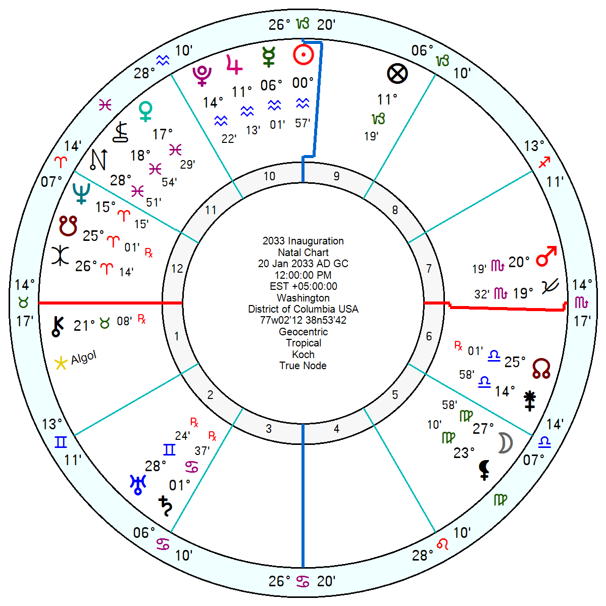 The 2033 Inauguration is much more upbeat with a super-confident Jupiter Pluto Sun in the 10th. Admittedly there will be some bully-boy behaviour and frustration from Mars in the 7th house of allies/enemies square Pluto. Tr Uranus Saturn will be moving during this term across the USA Venus, Jupiter, Saturn so again pushing for change.