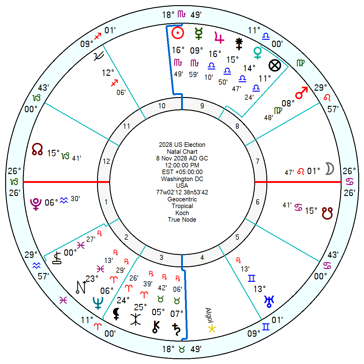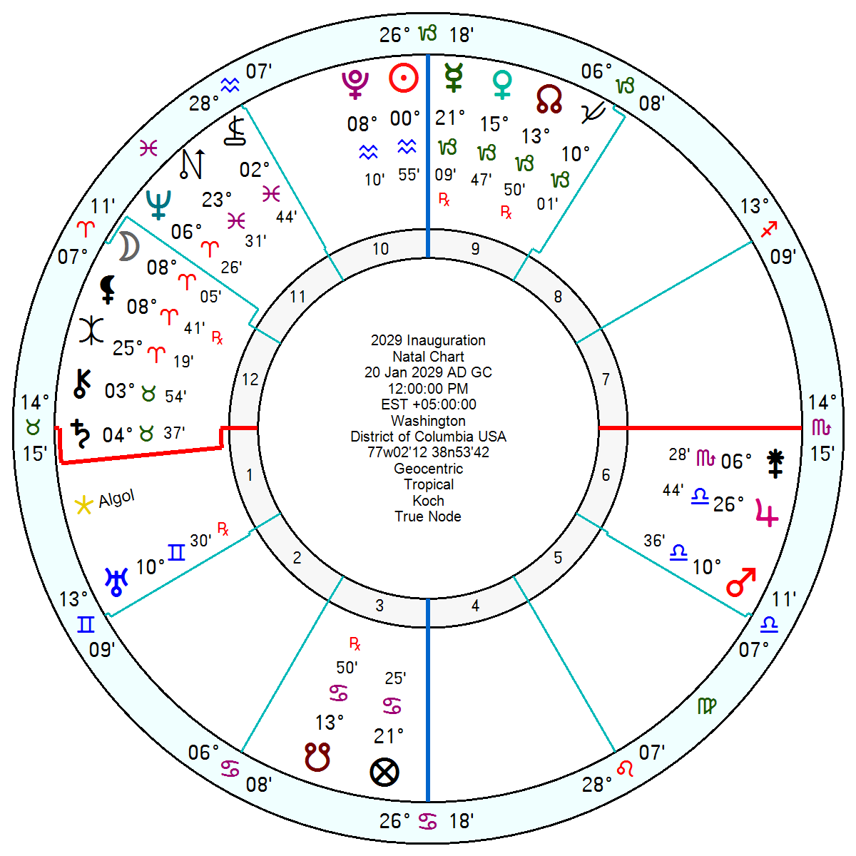 The 2028 election looks gridlocked and to a degree despairing with a yod of Pluto sextile Neptune inconjunct Mars and a bitterly argumentative Mercury square Pluto. The 2029 Inauguration won’t be as dictatorial as the 2025 Inauguration but will be volatile with a 10th house Pluto trine Uranus trine Mars, with Mars opposition Moon Neptune. Some changes pushed through, some risk and a confused, disillusioned electorate. There is also Saturn square Pluto for hardship, deprivation, a tough struggle which may be financial.