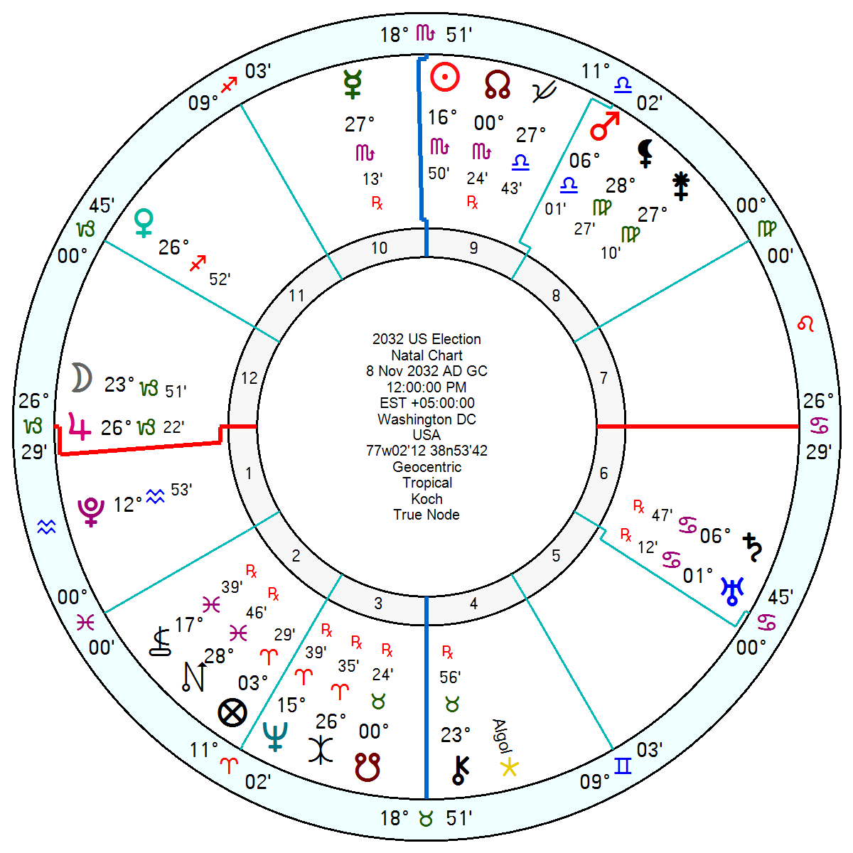 The 2032 election has tr Uranus Saturn in Cancer square Mars – excitable, with tensions surfacing. Though a chance to push for positive changes – Uranus conjunct Saturn = merging the best of the old with the best of the new.