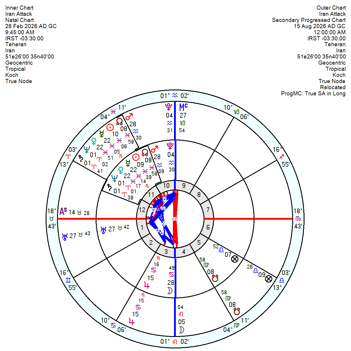 The Iran attack, 28 February 2026 9.45 am Teheran, which launched on an intense Moon opposition Pluto will clear that aspect which comes exact by progression in early August this year. This would coincide with thoughts about the 12 August Solar Eclipse which – “brings a time of breaking out of a negative, hopeless situation into positive phase with more options. A worry will disappear as solutions appear that need to be grasped.”