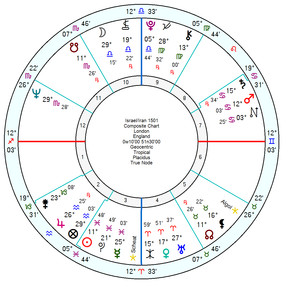 The Israel/Iran 1501 relationship chart shows this April as truly devastating with tr Uranus opposition the composite Neptune. With a slipping and sliding 2027; and a major upset and further rift in 2028 as tr Uranus squares the composite Sun and much worse in 2030/31 with tr Neptune square the outright dislike/warlike Saturn Mars conjunction.