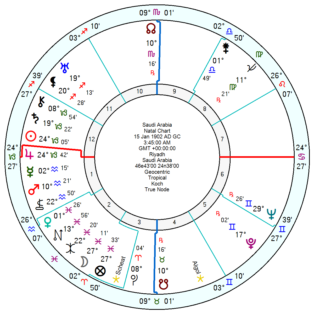 Saudi Arabia, 15 January 1902 3.45am Riyadh, will be facing a blockage along with fear and frustration in 2029 to 2032 as the SA Mars is conjunct their Pluto and opposition Uranus; with a hint before then in 2028 of an opportunistic push which could produce luck but could also go the other way as the SA Uranus square their Sin Jupiter.