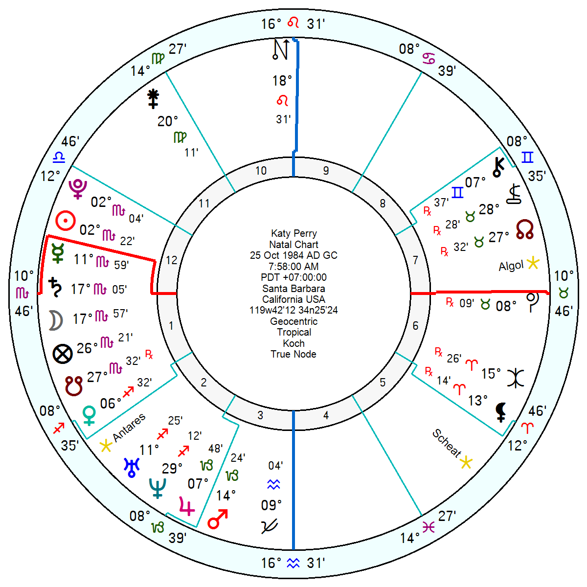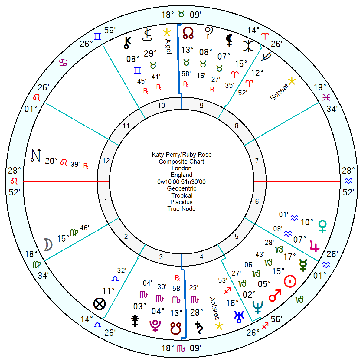 Her synastry with Katy Perry is complicated with KP’s Saturn in intense Scorpio square RR’s Midheaven so Ruby would feel blocked by her. KP’s Uranus and Neptune fall in RR’s 8th stirring up uncomfortable and elusive feelings and reactions. KP’s intense and controlling Sun Pluto conjunction in Scorpio and Moon Saturn in Scorpio falling in RR’s 6th and 7th house would make her tricky as a work and social companion.