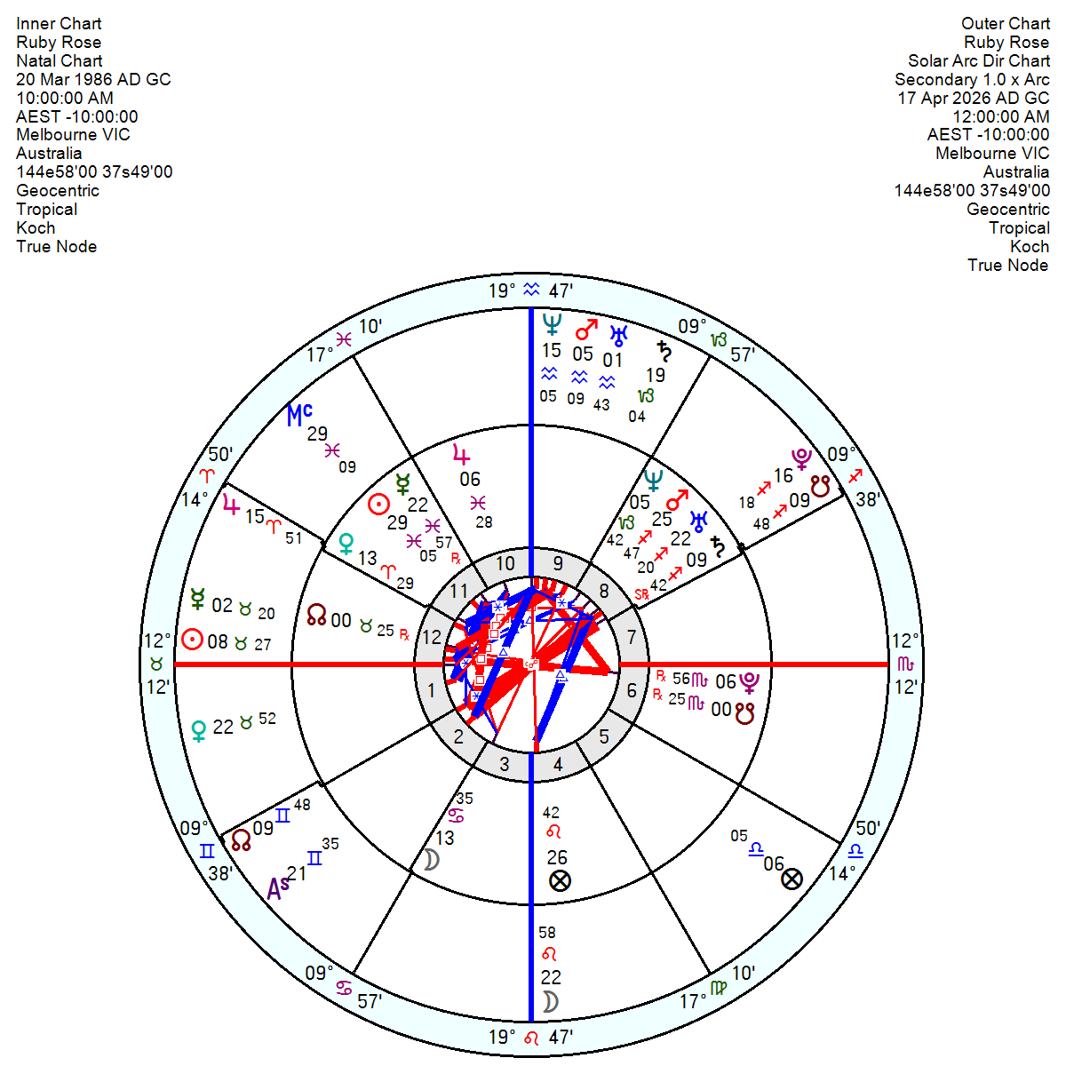Ruby Rose’s Solar Arc Midheaven is conjunct her Sun at the moment which will put her in the spotlight. But she will run into a major blockage late 2027 into 2028 when her Solar Arc Mars is square her Pluto.